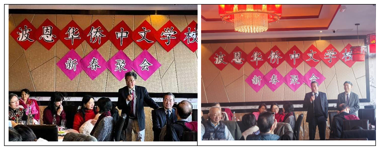 学校理事会邓程礼会长向参加新春聚会谢师宴教师们以及董事理事们表示热烈的欢迎。 校长卢康乐博士向大家介绍了参加聚会的各位资深董事和理事。校董会文建立主席发表了热 情洋溢的新年贺词。副校长袁素明老师布置了秋季40周年校庆的排演节目任务,本年度将增 加评奖环节,鼓励师生早早准备。赵海威先生代表波恩校区家长会感谢理事们、老师们对学 校的辛勤付出,表示家长会将在9月27日承担起校庆的饮食和后勤组织工作。王晶女士代表 Hürth 分校家长会表达了对学校的谢意,将与各方携手办好校庆。