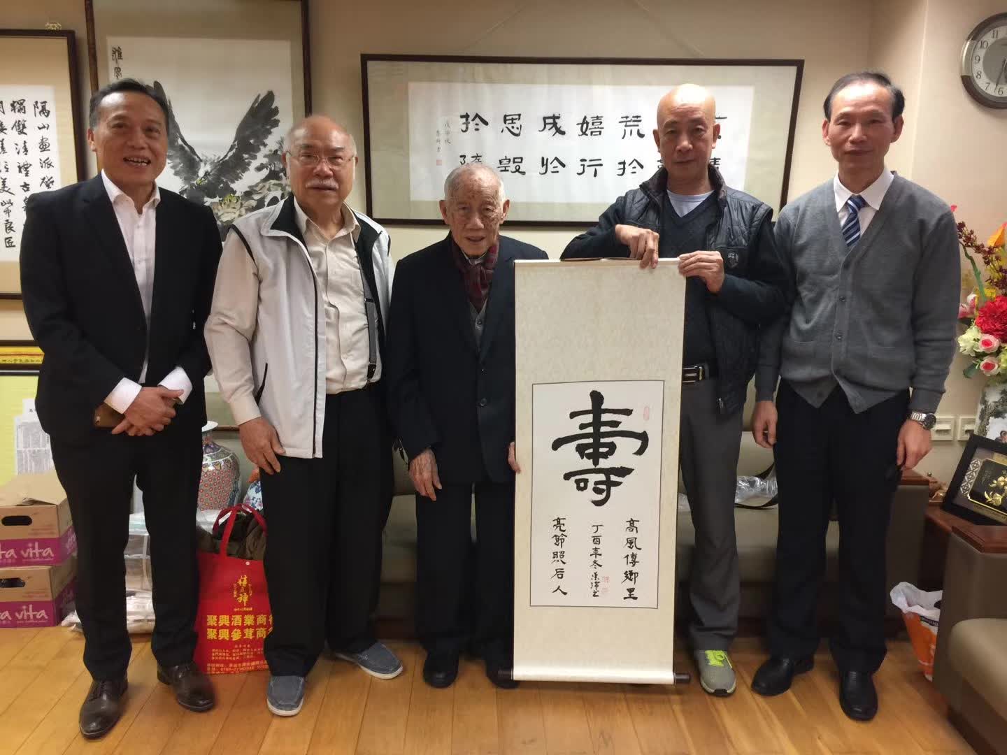 图为澳门尹氏宗亲会会长尹景威向尹君乐先生祝贺百岁诞辰