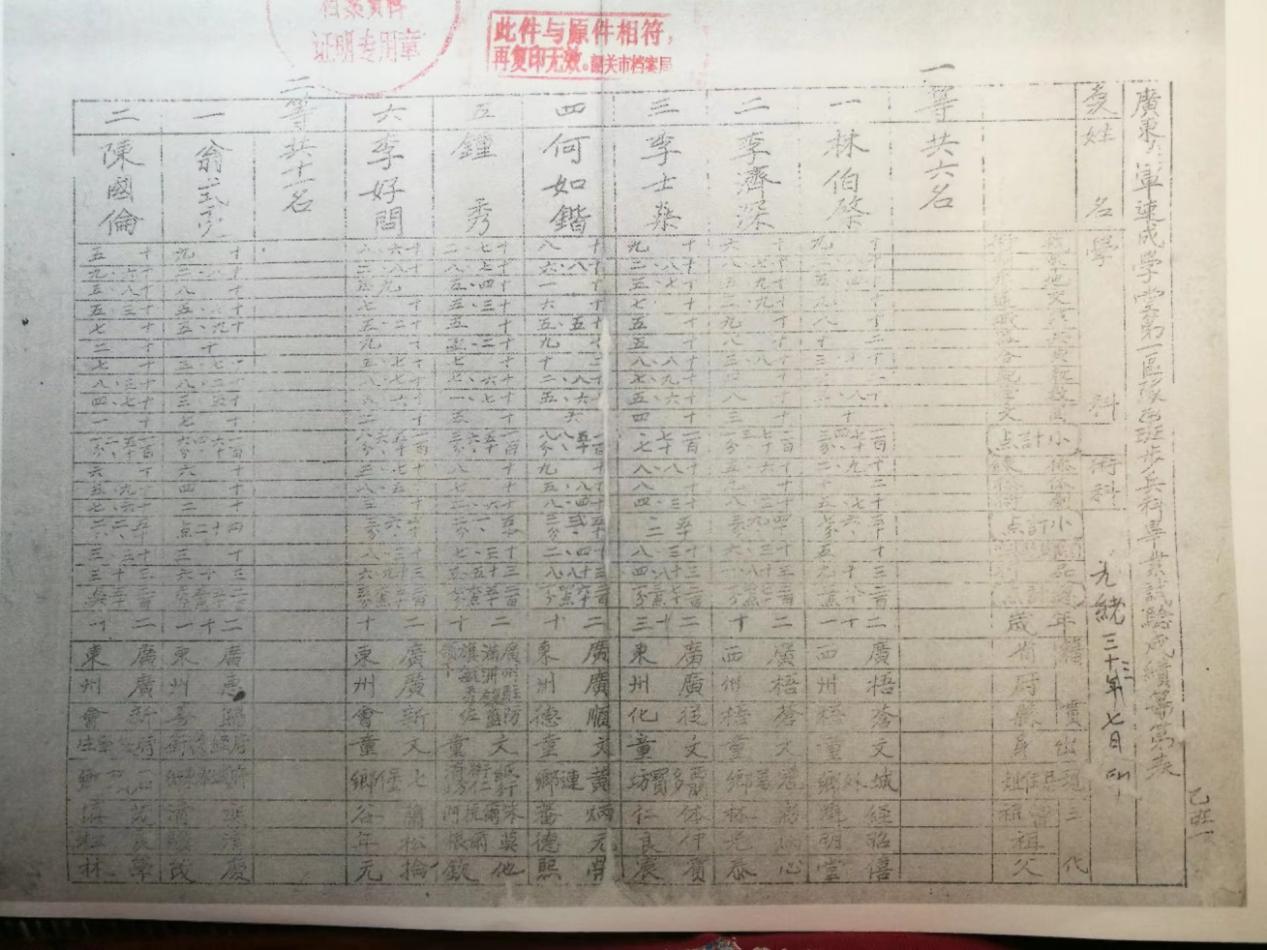 图为广东陆军速成学校步兵科第一区队学生毕业试验成绩表